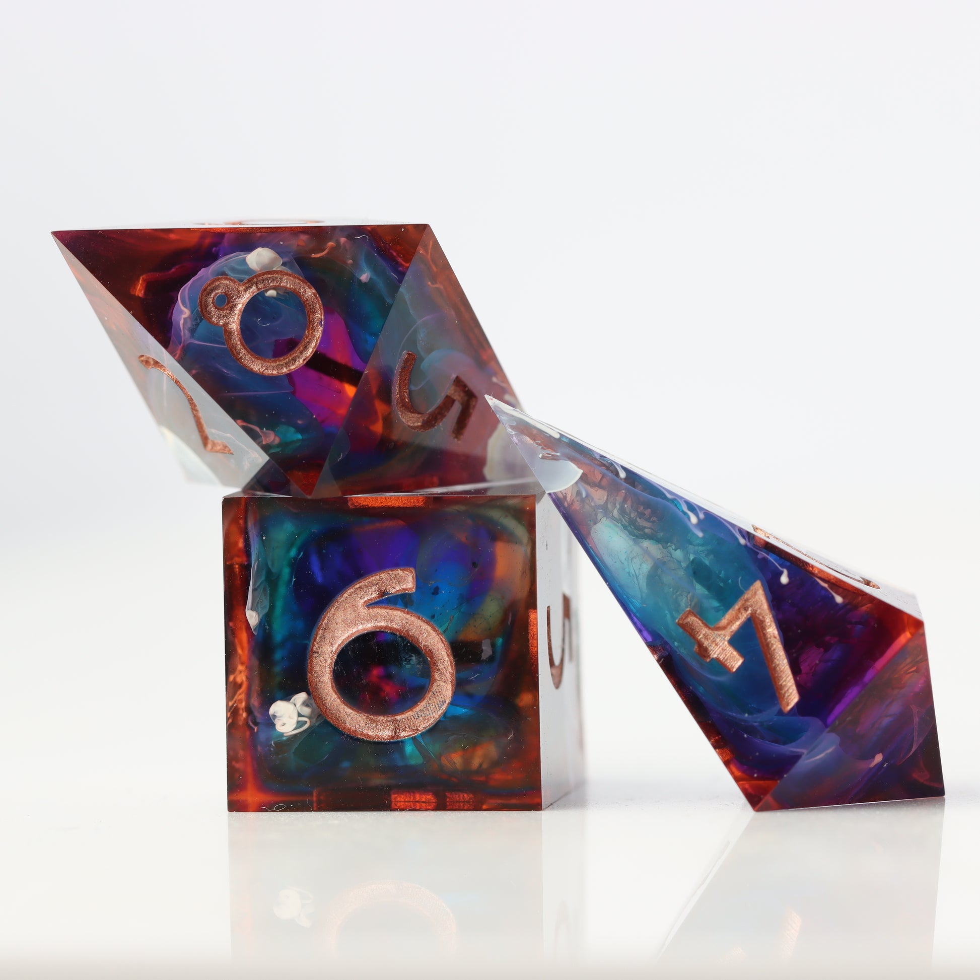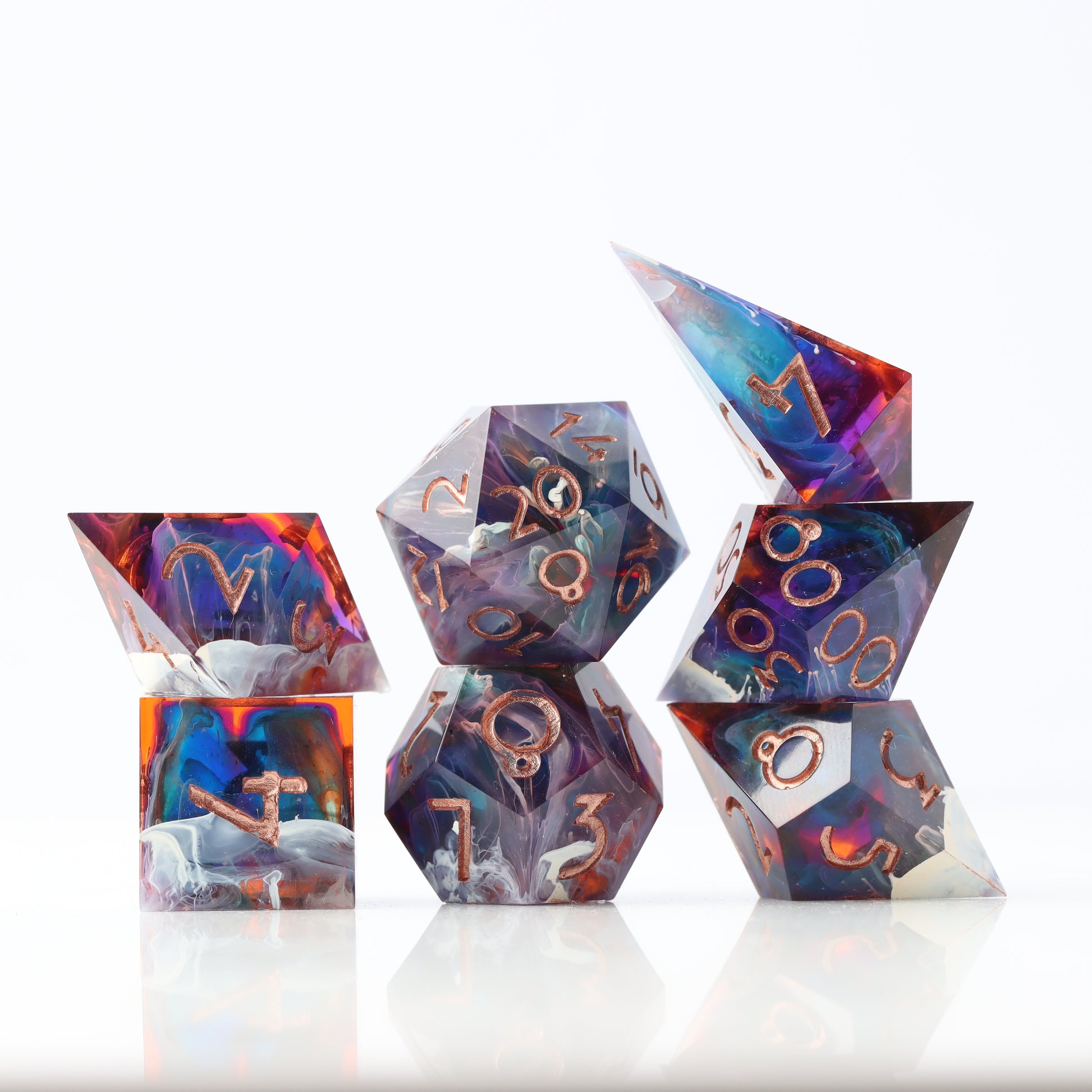 Fiery orange clashes with layers of ocean blue and teal in this translucent dice. White waves crest and drip through in a petri style. If you look closely enough, you can see a royal purple core inside.