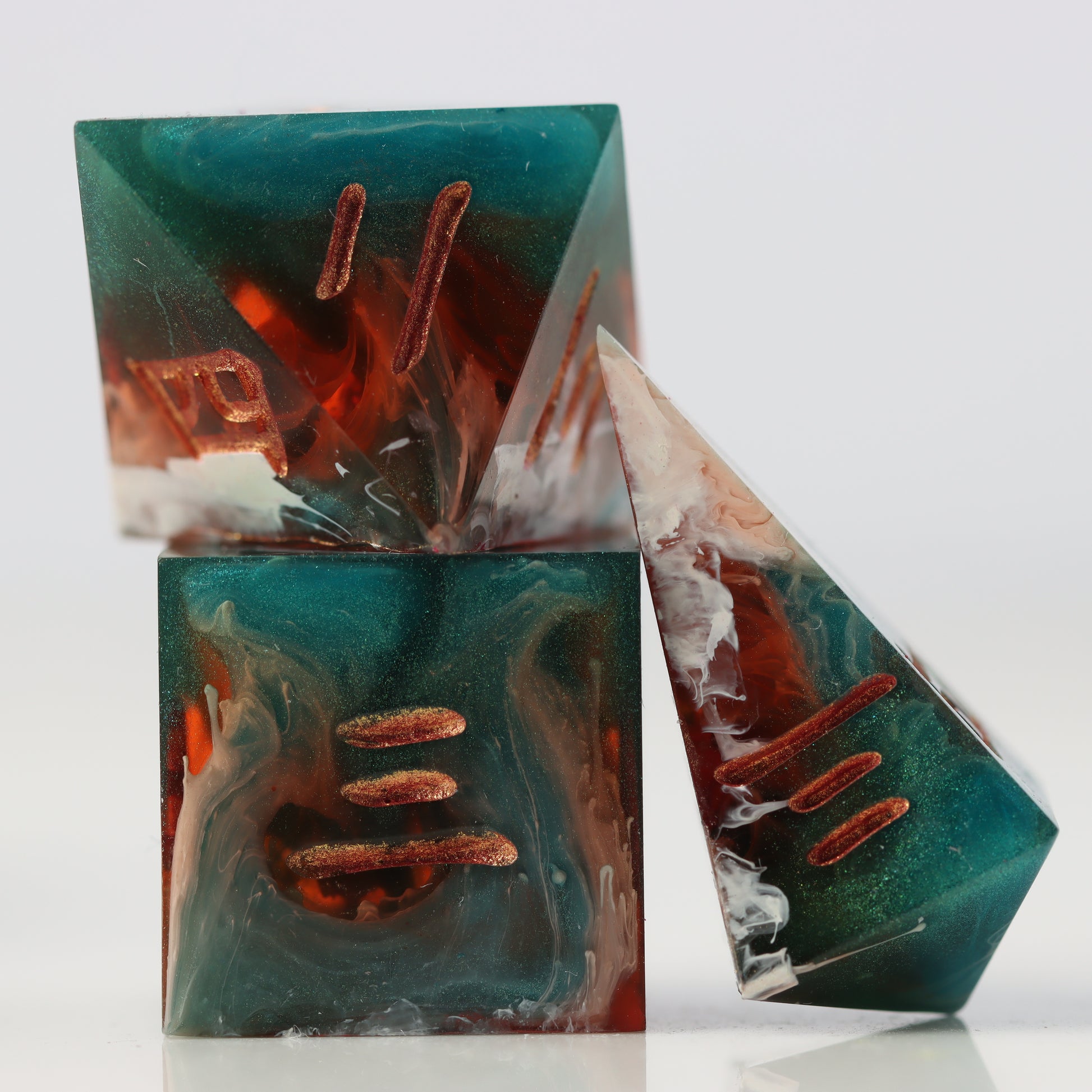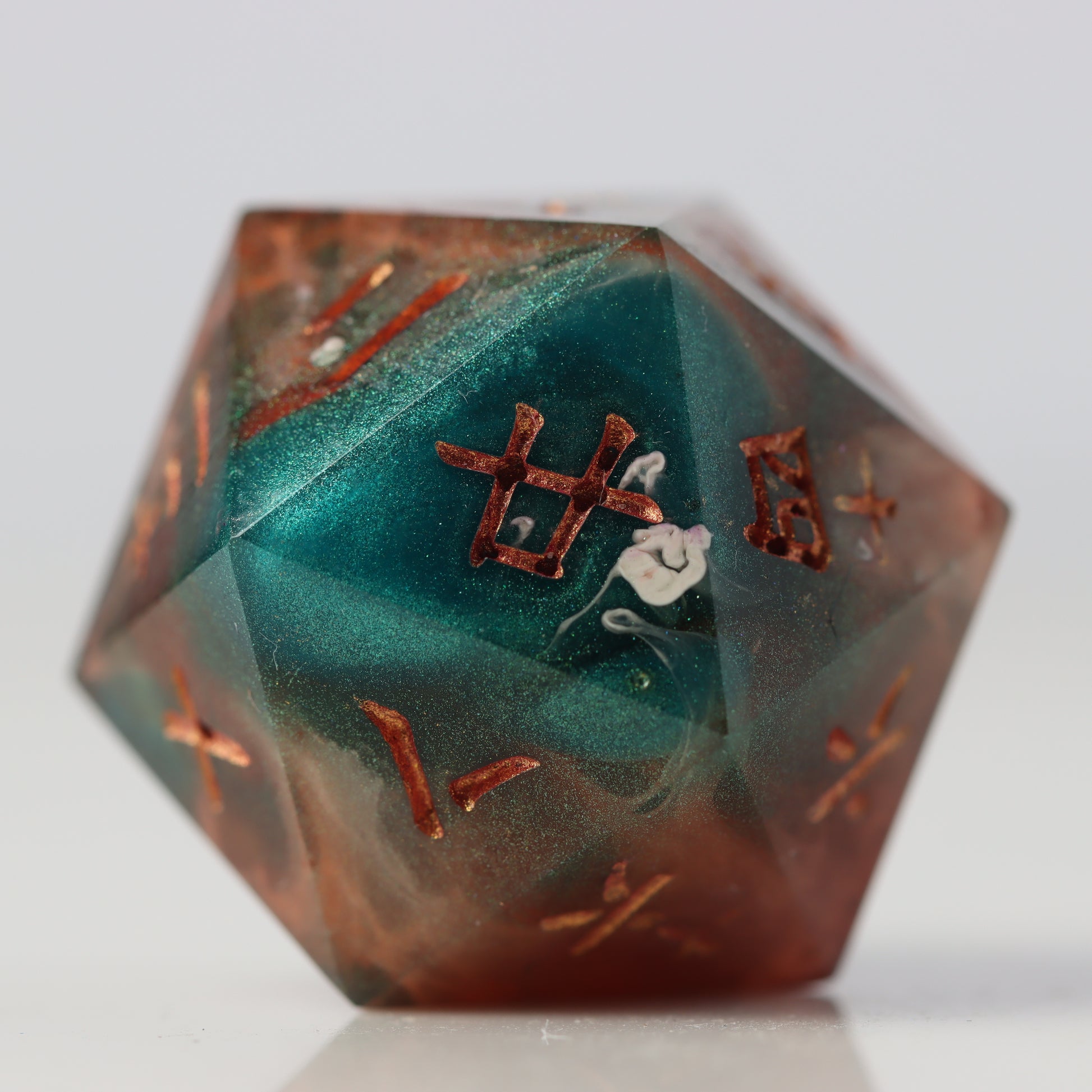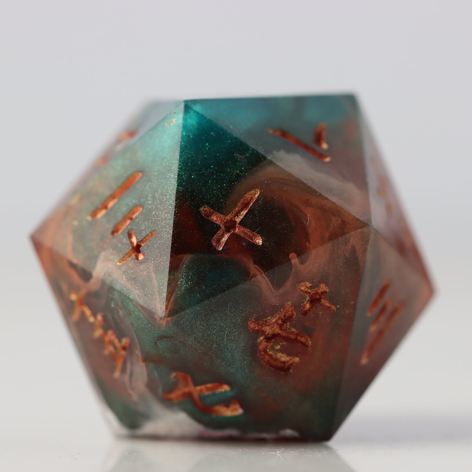 A petri style dice where copper clashes with jade green waves. Drops of white streak throughout.