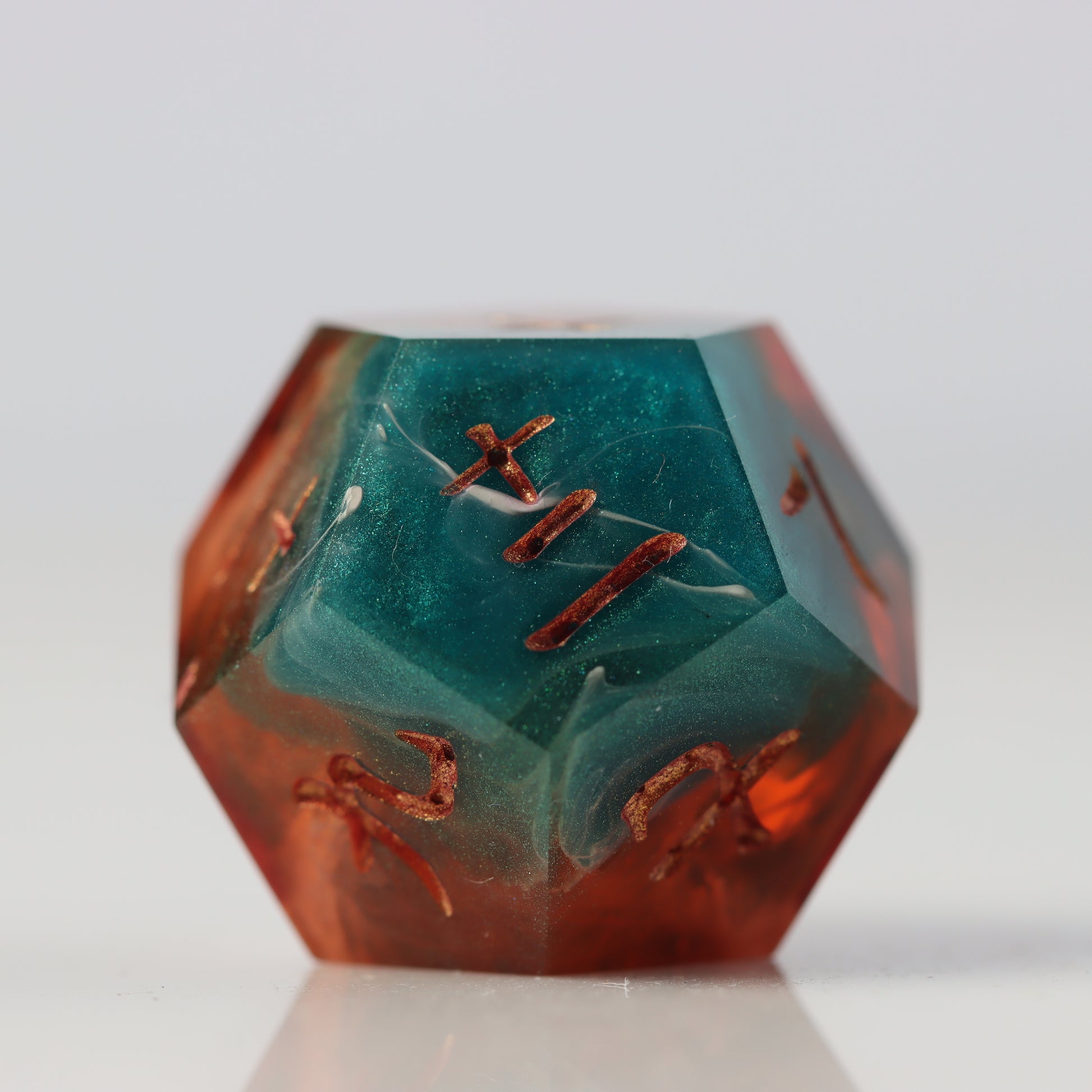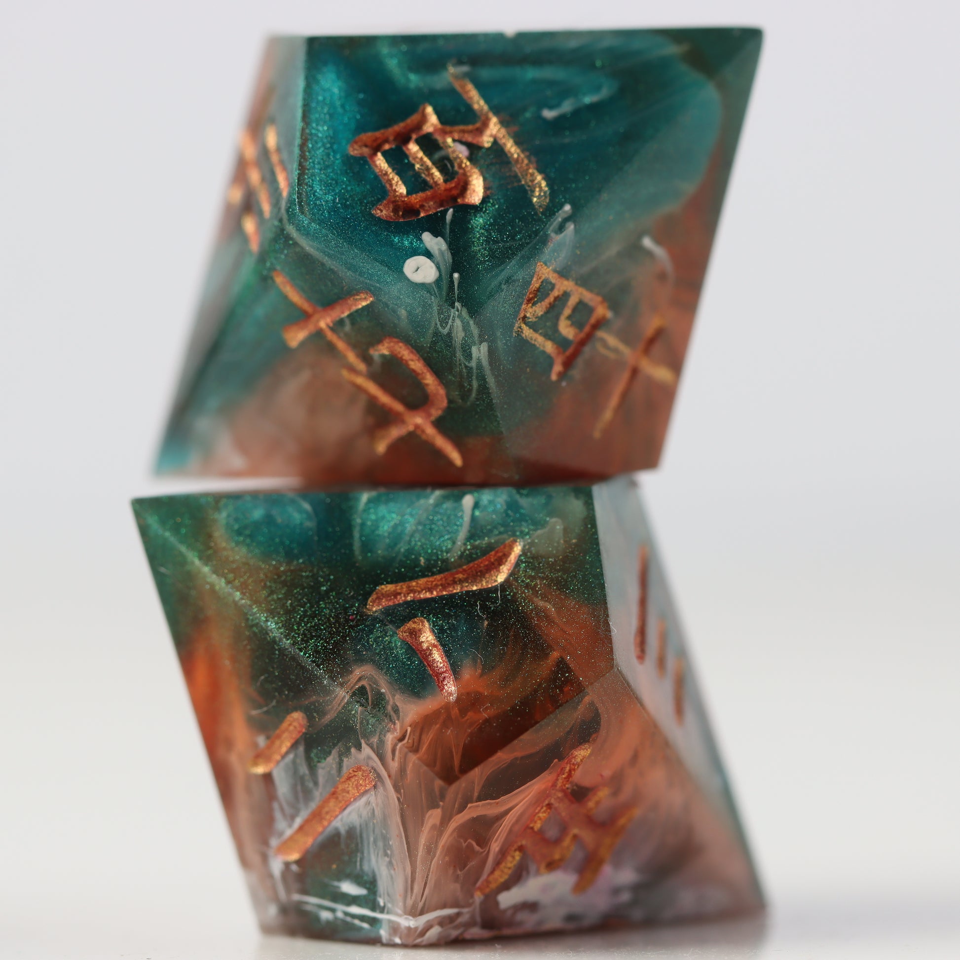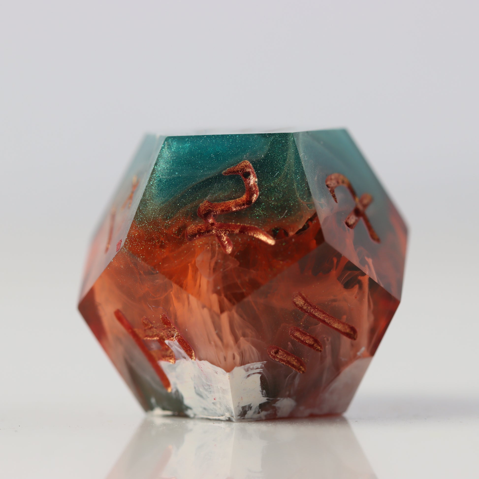 A petri style dice where copper clashes with jade green waves. Drops of white streak throughout.
