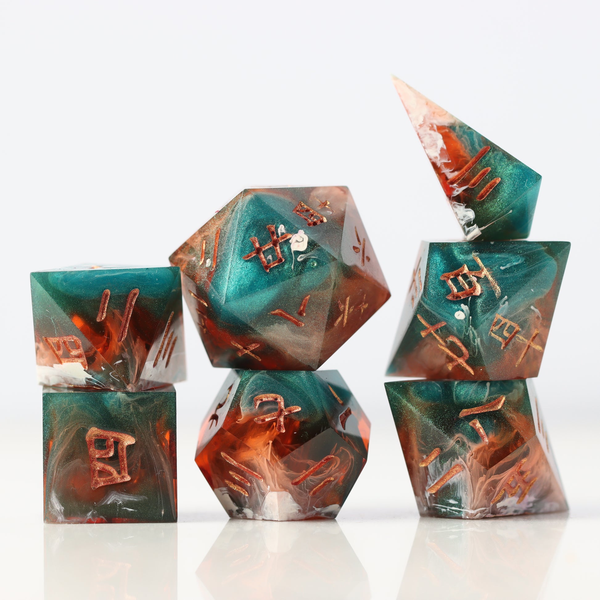 Hanzi is a custom 7pc dice set made with Kanji numbers. Fractal have created the models, masters and molds from scratch to create this unique themed dice set.