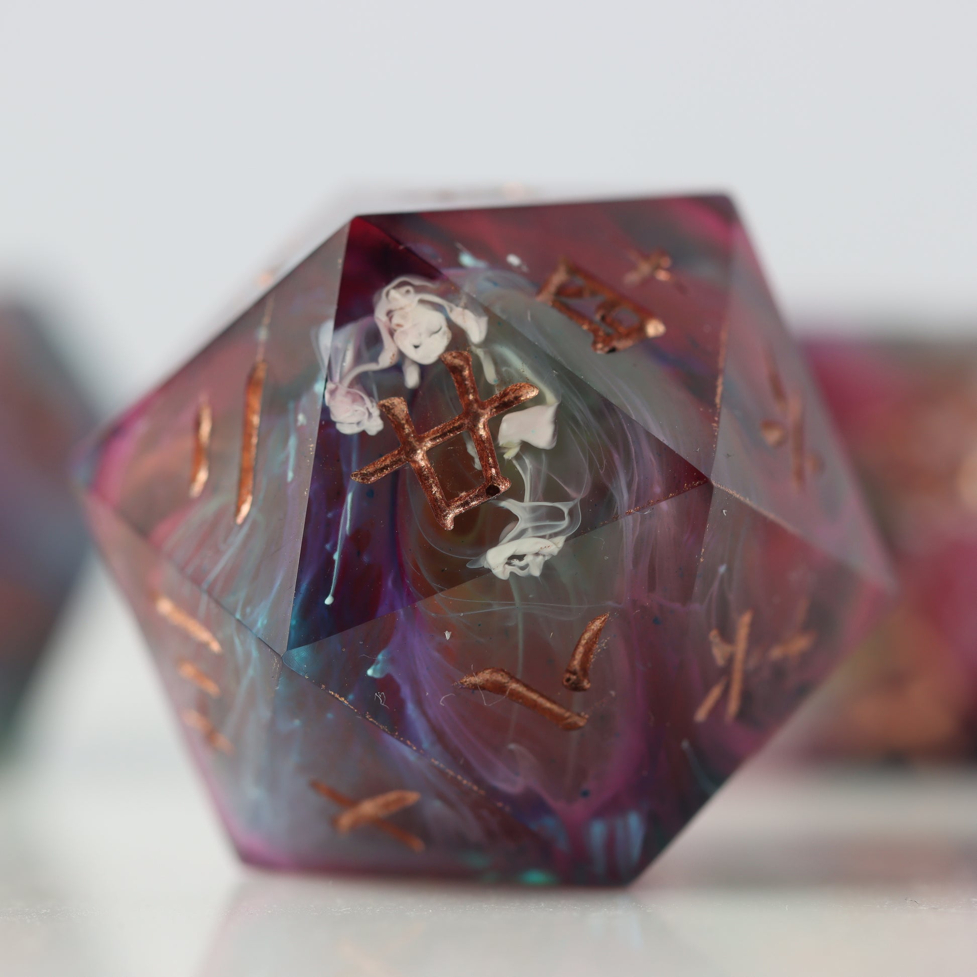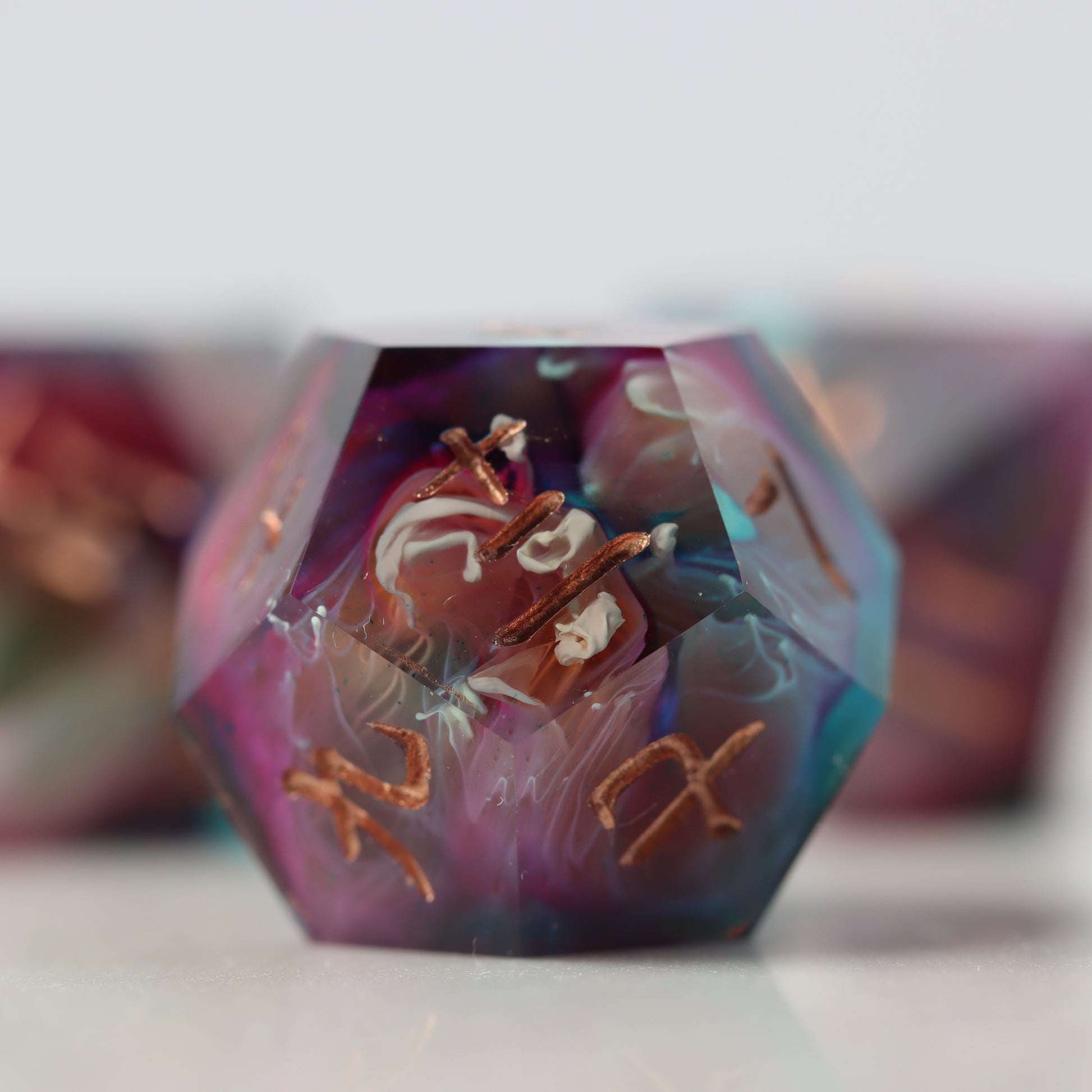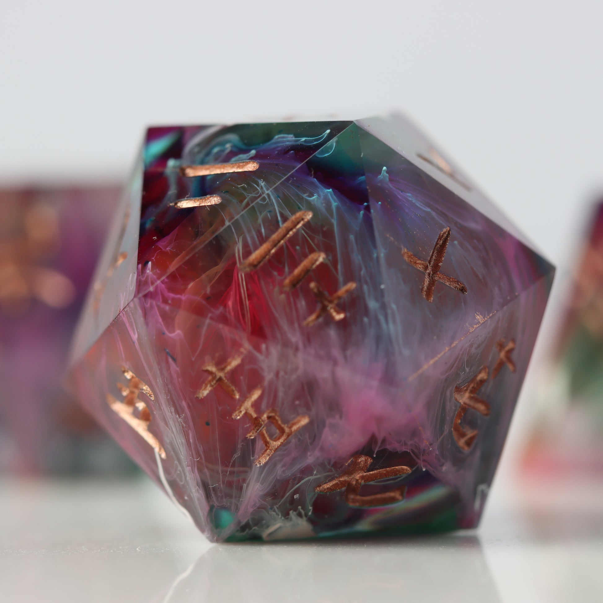 Please be aware that all Fractal Gems dice are handmade and therefore may contain some small imperfections and flaws from the crafting process. These may include micro-scratches, microbubbles, mold marks, painting errors, or other small imperfections. Any major flaws will be listed and photographed (where possible) below and the product is priced accordingly. While we do our best to ensure these flaws are minimal, please bear this in mind before purchasing.
