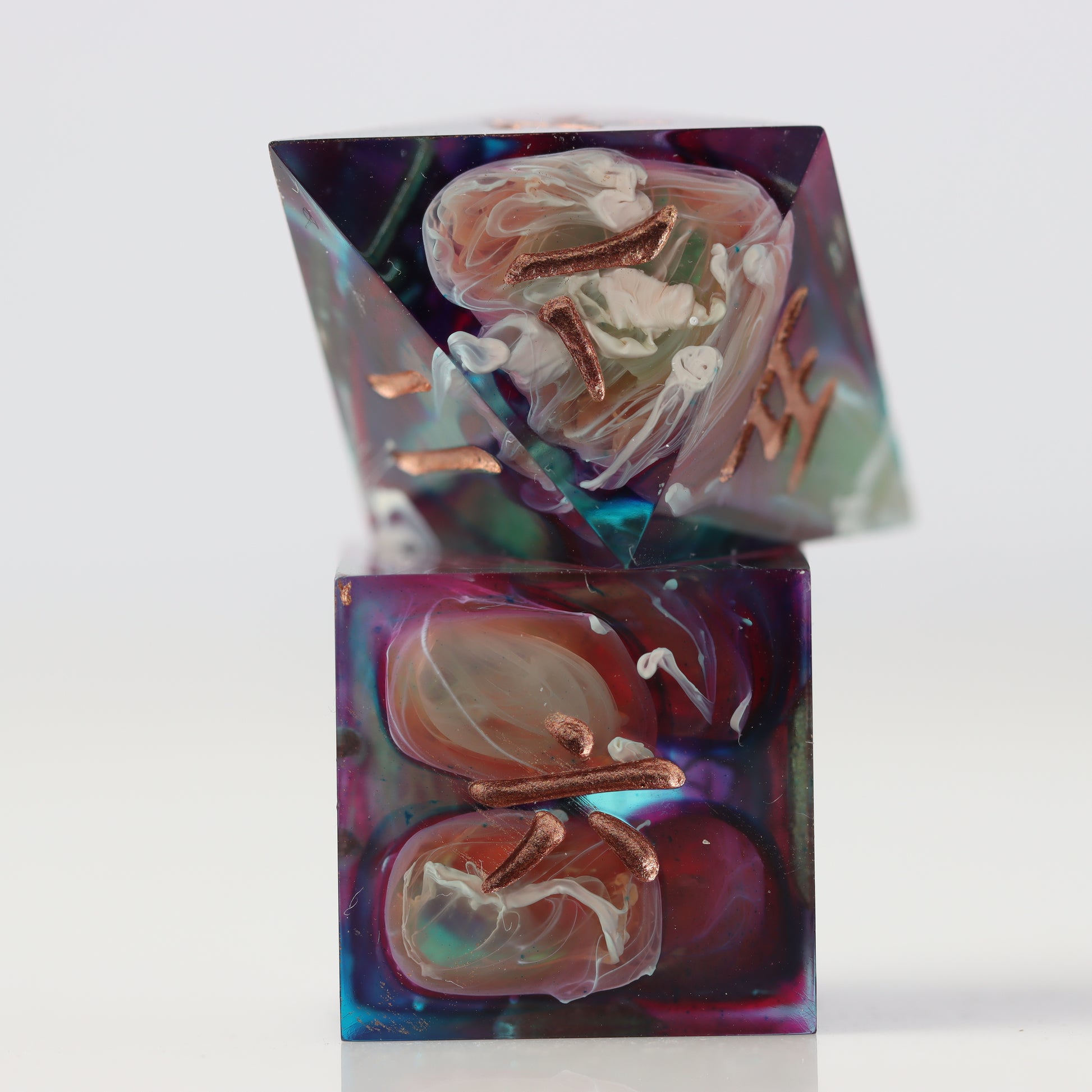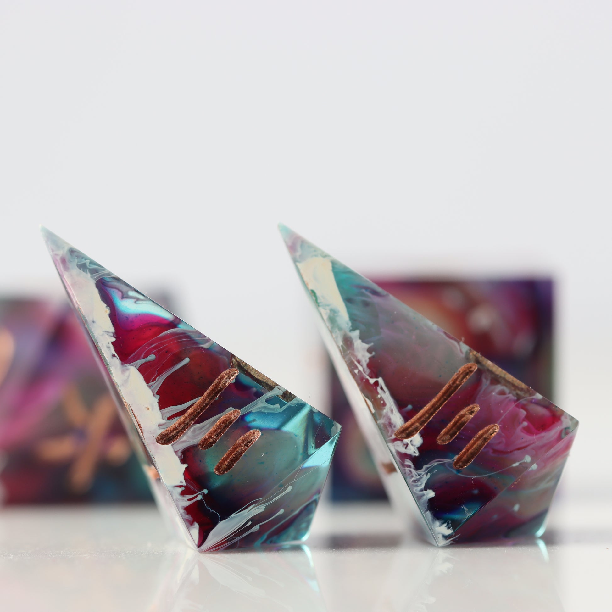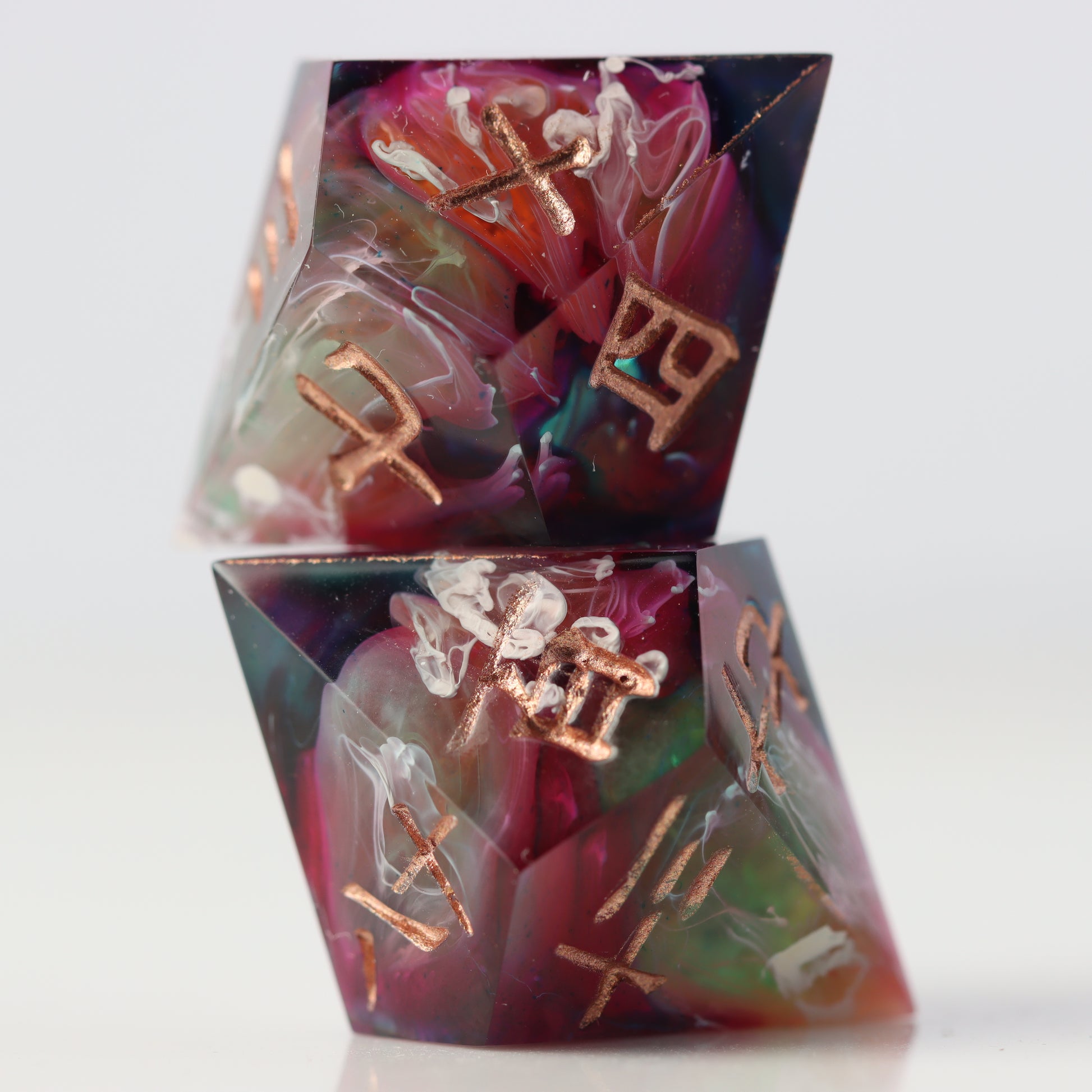 Please be aware that all Fractal Gems dice are handmade and therefore may contain some small imperfections and flaws from the crafting process. These may include micro-scratches, microbubbles, mold marks, painting errors, or other small imperfections. Any major flaws will be listed and photographed (where possible) below and the product is priced accordingly. While we do our best to ensure these flaws are minimal, please bear this in mind before purchasing.