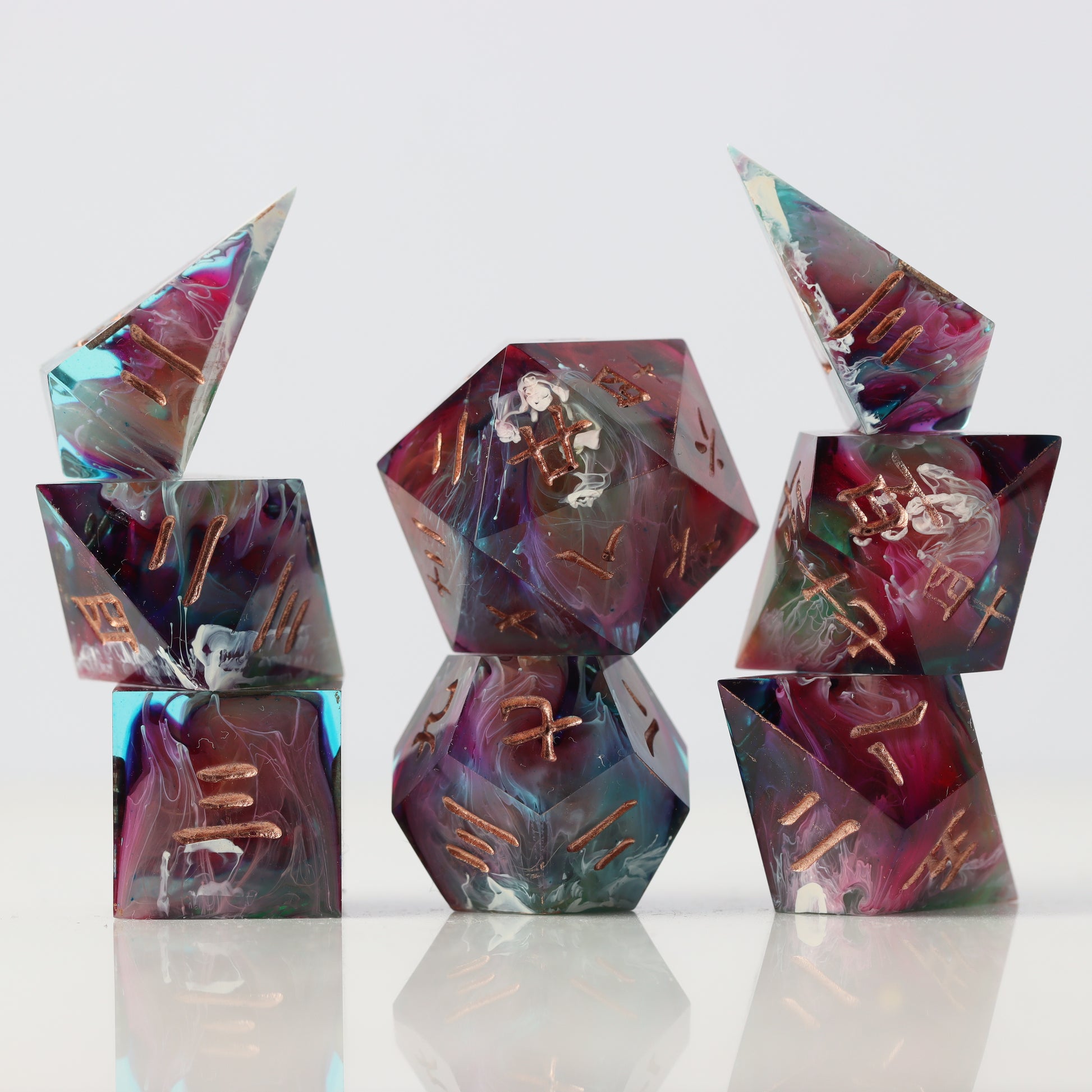 Hanzi is a custom 7pc dice set made with Kanji numbers. Fractal have created the models, masters and molds from scratch to create this unique themed dice set.