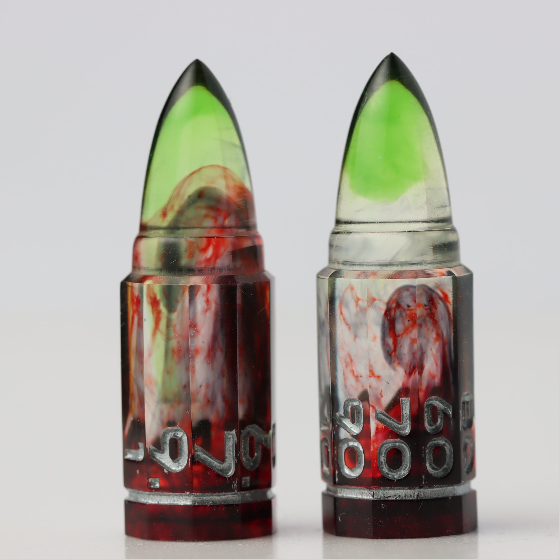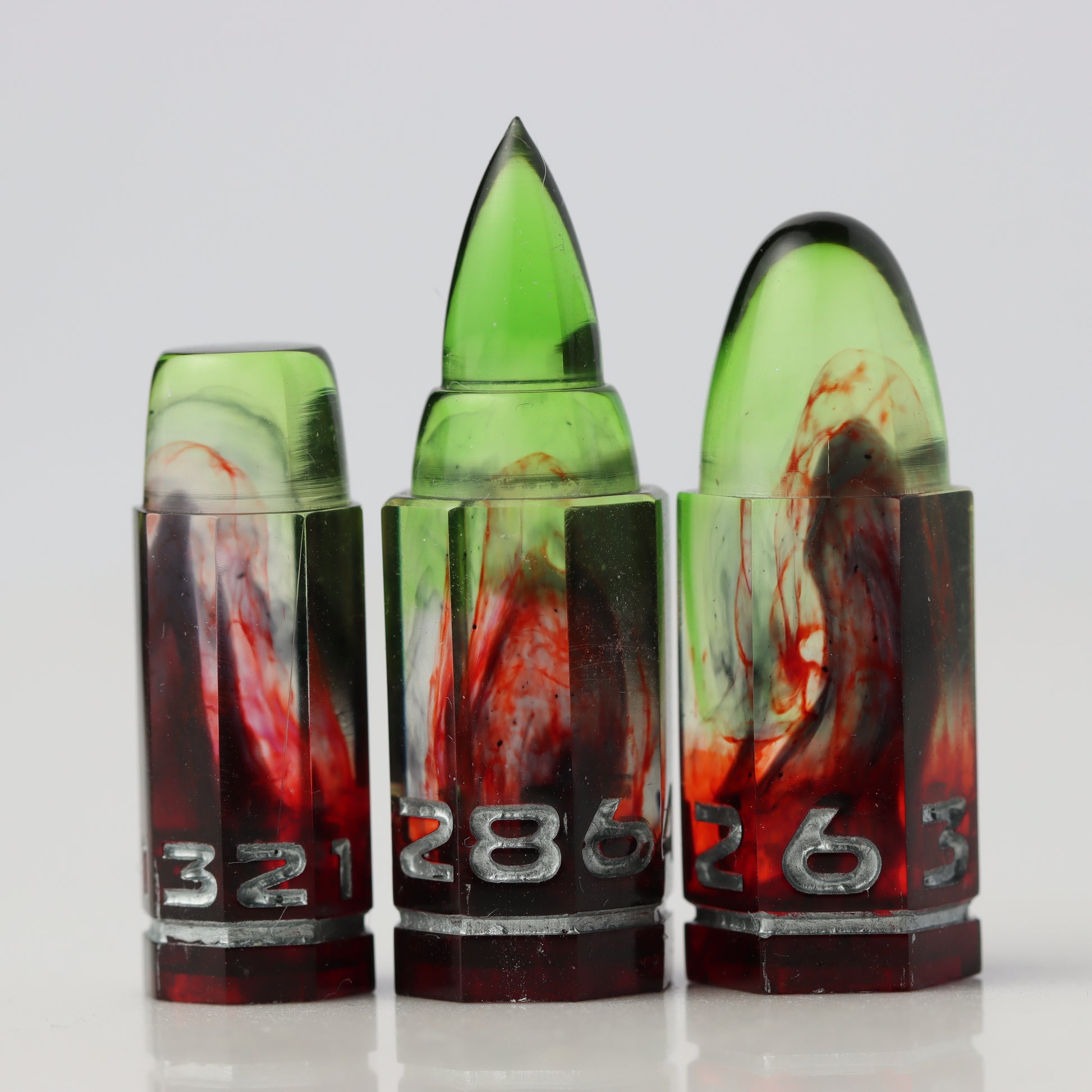 Arsenal is a custom 8pc dice set made in the style of bullets from various firearms. Fractal has created the models, masters, and molds from scratch to create this unique themed dice set.