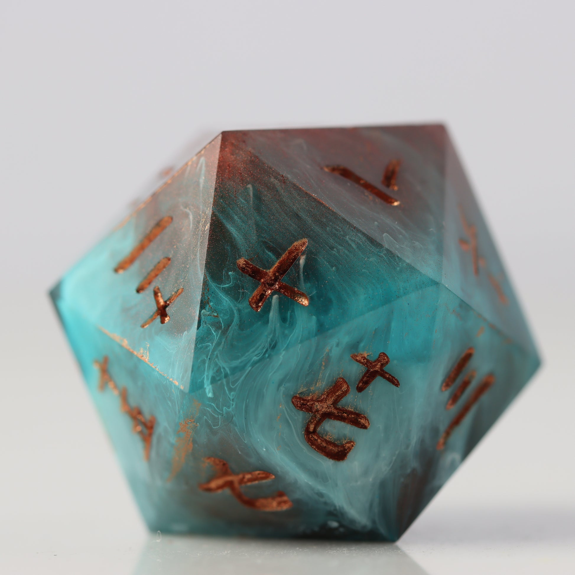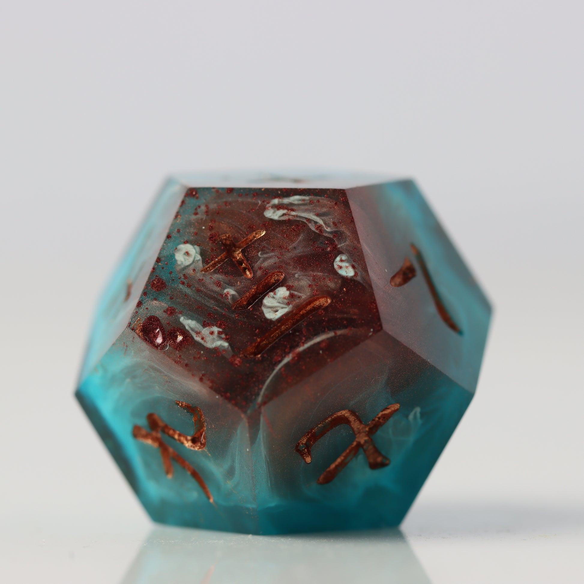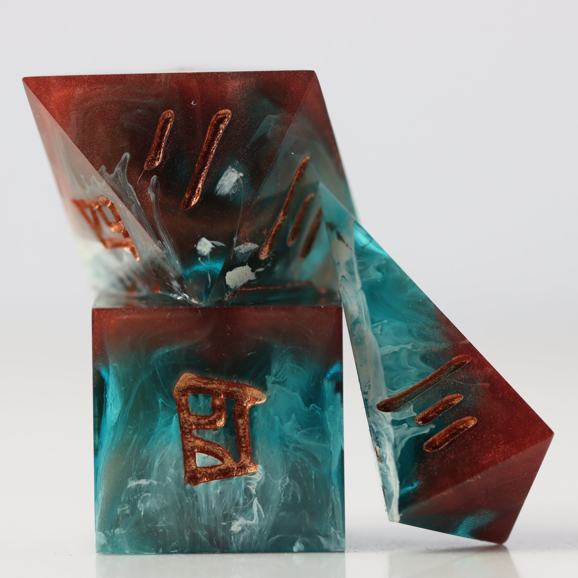 A petri style dice where copper clashes with aquamarine waves. Drips of white streak throughout. Inked in halo pink gold.