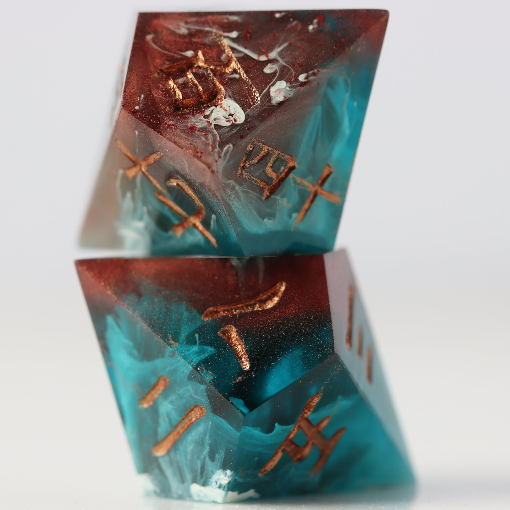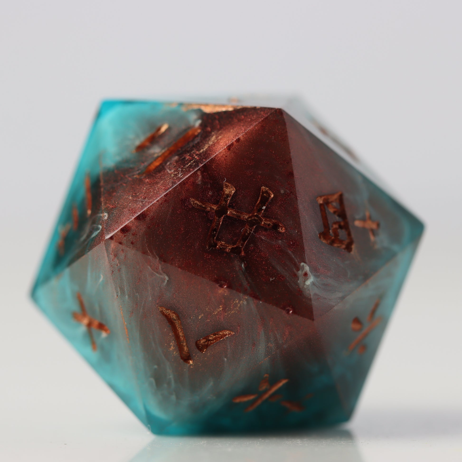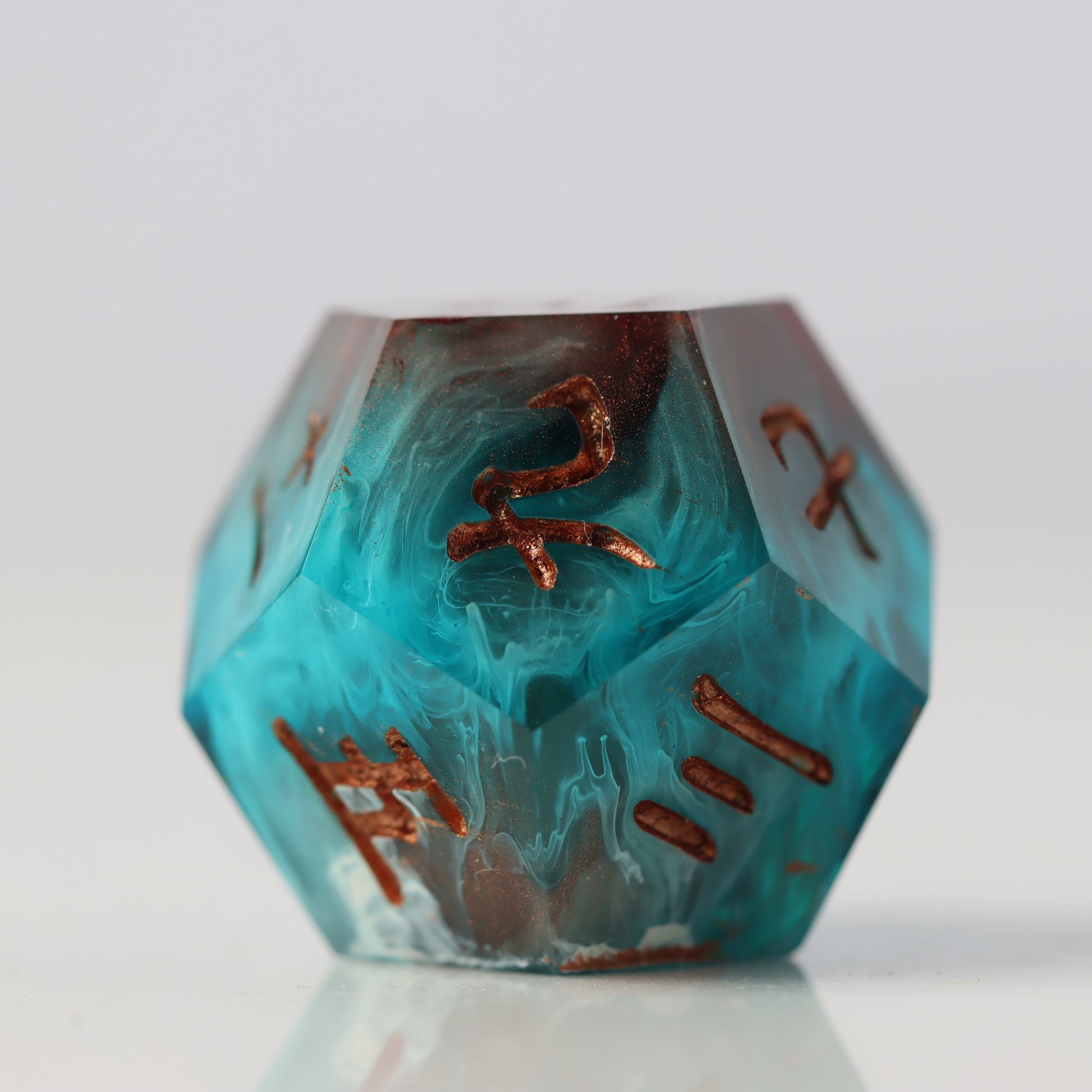 A petri style dice where copper clashes with aquamarine waves. Drips of white streak throughout. Inked in halo pink gold.