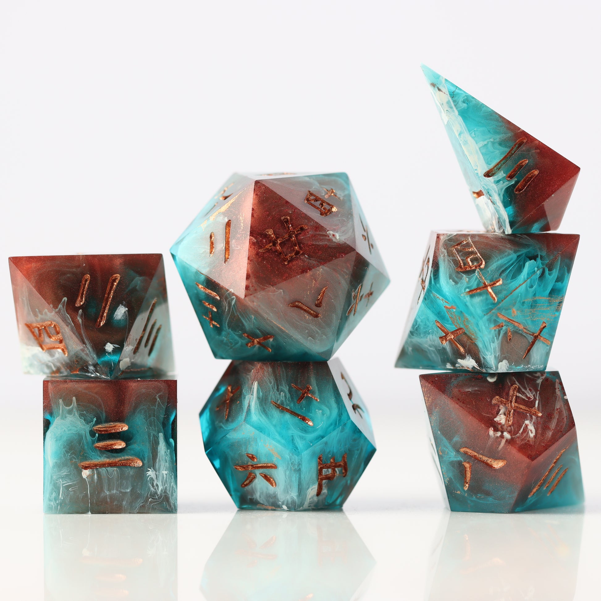 Hanzi is a custom 7pc dice set made with Kanji numbers. Fractal have created the models, masters and molds from scratch to create this unique themed dice set.