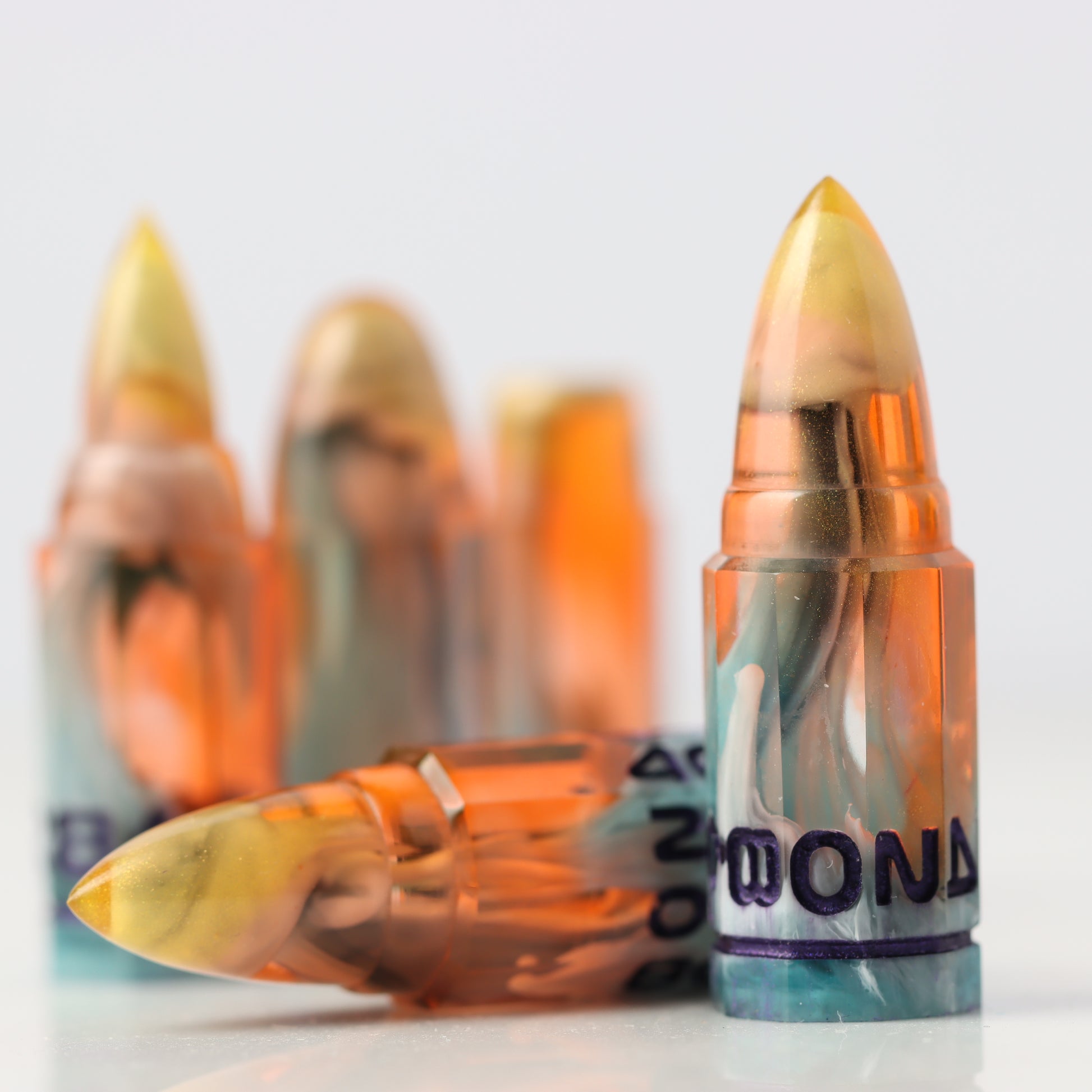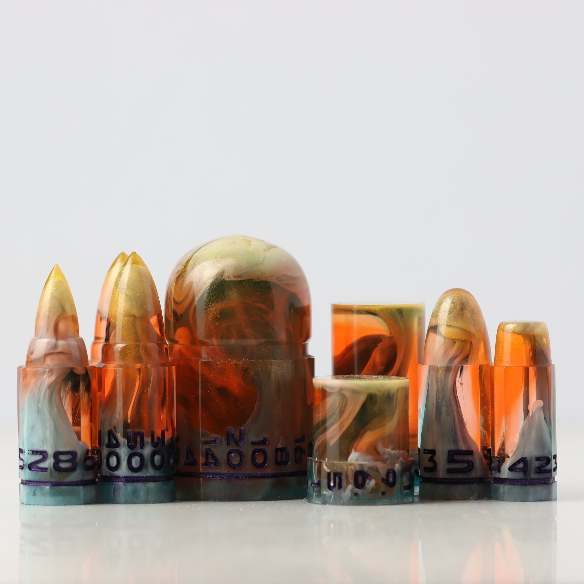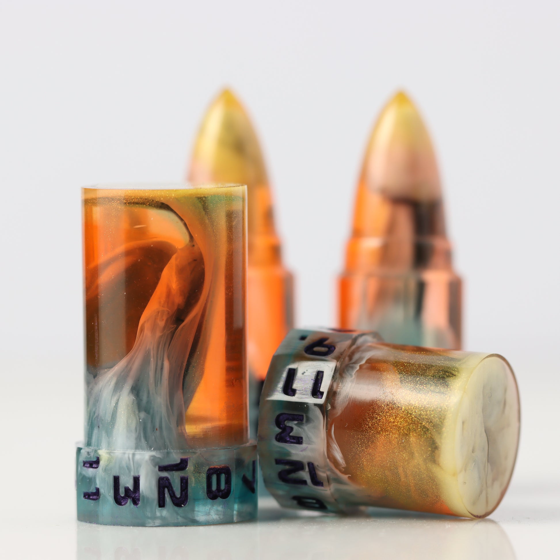 Arsenal is a custom 8pc dice set made in the style of bullets from various firearms. Fractal has created the models, masters, and molds from scratch to create this unique themed dice set.